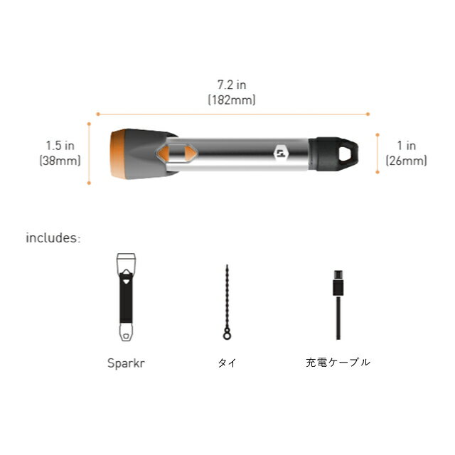 商品名 sparkr/スパーカー 品番 sparkr 充電時間 6時間 連続点灯時間 4時間(High)/16時間(Low) 充電池容量 3,350mAh 入力(MicroUSB端子) 5W (5V 1A) ライトの明るさ 400ルーメン(High) 重量 180g 注意事項 ・ご使用前に本取扱脱明書を読み、使用方法にしたがってSparkrをご利用下さい。